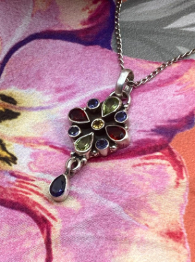 🦢 Přívěsek je vyrobený ze stříbra 925 se zasazeným granátem, olivínem, citrínem a ametystem.
