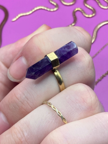 🦢 Prsten je vyroben z mosazi se vsazeným ametystem.