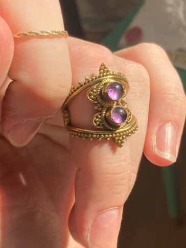 🦢 Prsten je vyroben z mosazi se vsazeným ametystem.