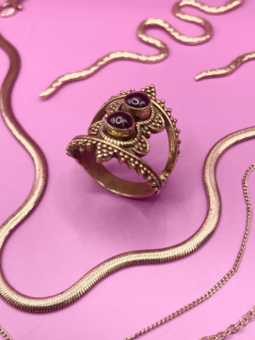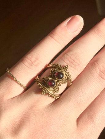 🦢 Prsten je vyroben z mosazi se vsazenými rubíny.