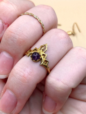 🦢 Prsten je vyroben z mosazi se vsazeným ametystem.