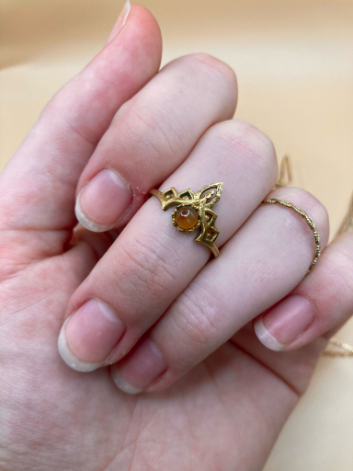 🦢 Prsten je vyroben z mosazi se vsazeným karneolem.