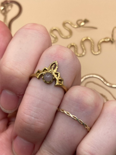 🦢 Prsten je vyroben z mosazi se vsazeným růženínem.