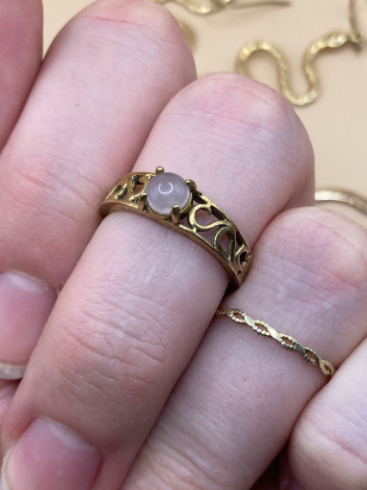 🦢 Prsten je vyroben z mosazi se vsazeným růženínem.