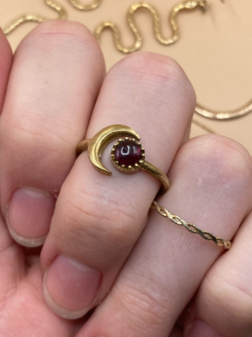 🦢 Prsten je vyroben z mosazi se vsazeným rubínem.