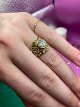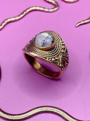 🦢 Prsten je vyroben z mosazi se vsazeným labradoritem.