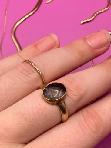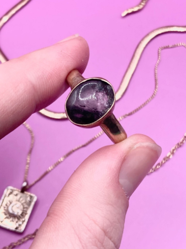 🦢 Prsten je vyroben z mosazi se vsazeným labradoritem.
