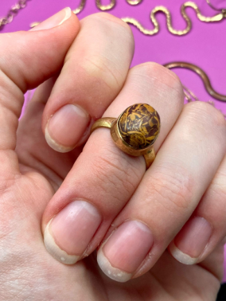 🦢 Prsten je vyroben z mosazi se vsazeným miriam jaspisem.